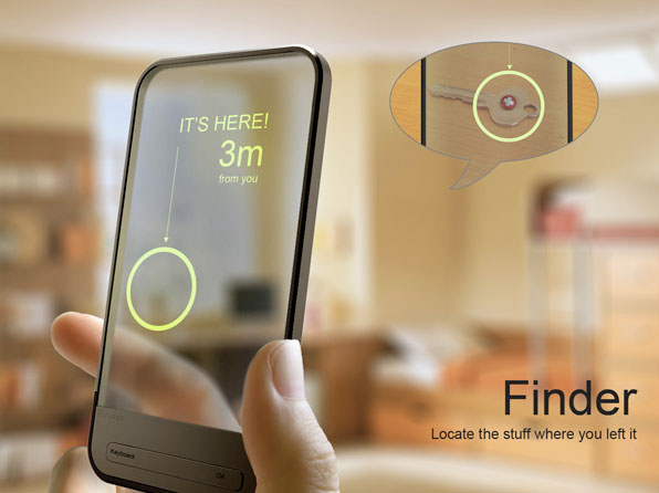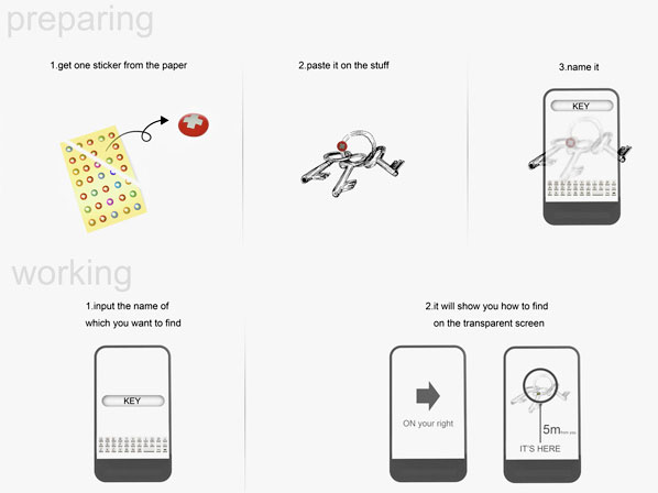 Bei der Suche kann jetzt ein stylisher RFID Locator verwendet werden. Designt von Chu Wang, Qiujin Kou, Qian Yin and Yonghua Zhang besteht der Locator aus zwei Teilen, dem Haupt-Terminal und dem Lokalisierungs-Aufkleber. Die Aufkleber werden einfach auf den gewünschten Gegenständen angebracht und mit dem Terminal synchronisiert. Wenn man nun einen der markierten Gegenstände nicht finden kann, wird dieser nach Aktivierung auf dem transparenten Display des Suchgeräts angezeigt.